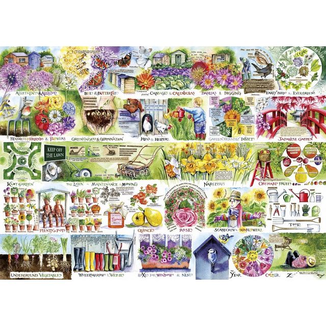 From sturdy allotment sheds to pretty Japanese gardens and catching some much-needed Z’s after all the hard work has been done; this colourful jigsaw from Val Goldfinch will get anyone excited about a spot of gardening or puzzling. Gibsons has been a British family business since 1919. They produce the UK's largest range of premium quality puzzles. With firmly interlocking pieces made from 100% recycled board, they produce beautiful images from the finest artists. Proudly entertaining generations! 1000 PiecesFinished size: Approx. Approx. 68 cm x 49 cm / 27 in x 19 inArt by: Val Goldfinch